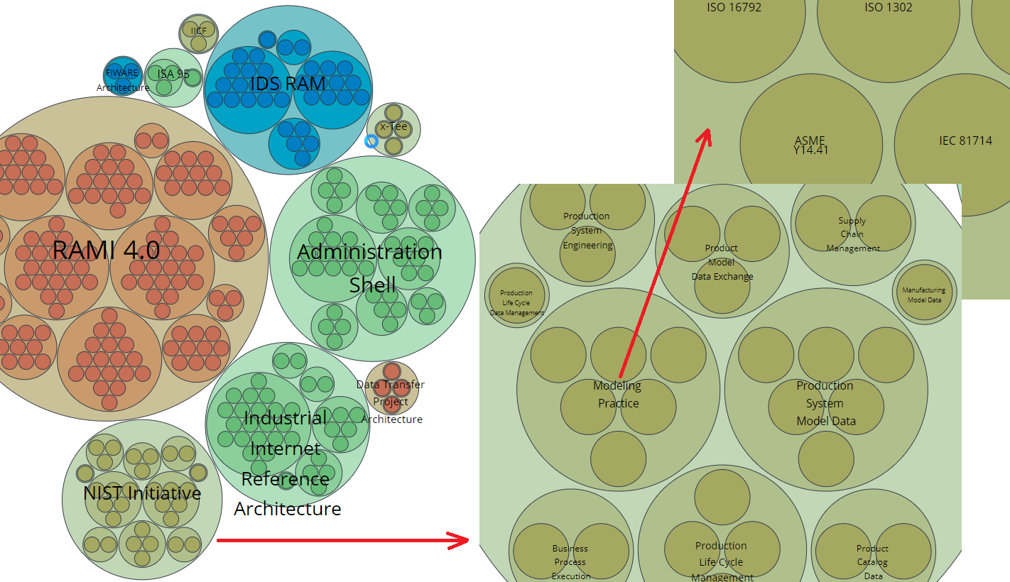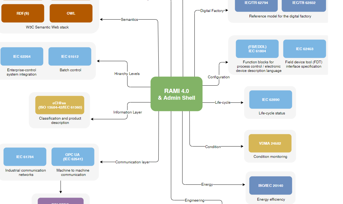 The main view of I40KG shows the integrative role of RAMI 4.0 and Admin Shell, their various areas, and how they build upon existing areas in those areas.